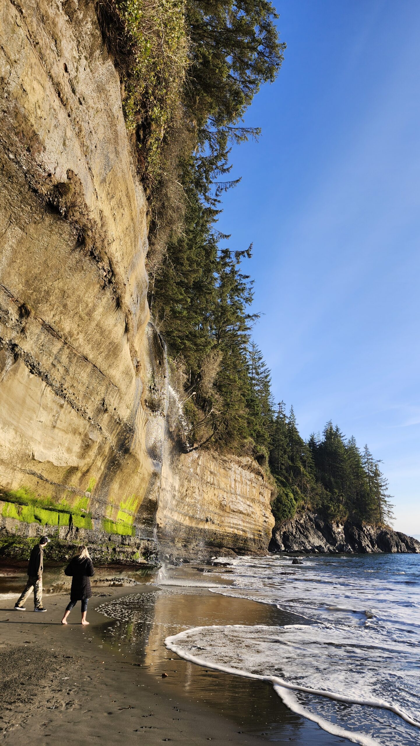 First you wander between Sitka Giants. Then you step out of the forest and hear it before you see it. A waterfall pouring over sandstone cliffs. Mist in the air. Ocean at your feet.